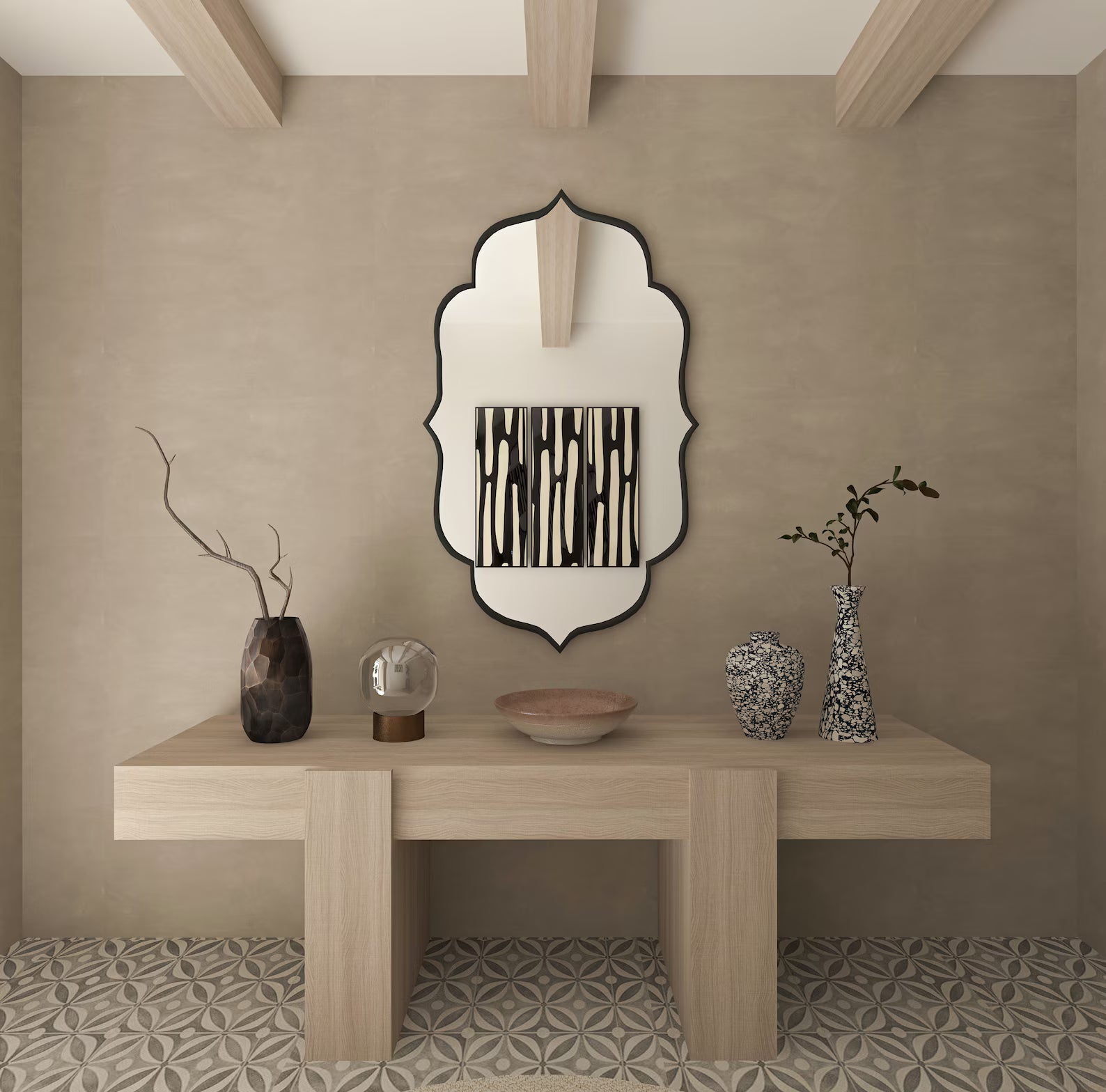 Ornate Moroccan Wall Mirror is a decorative statement piece designed to bring warmth and character into any room. Its sculpted frame, inspired by traditional Moroccan architecture, adds soft curves and an elegant silhouette that instantly elevates the space. The mirror works beautifully above a bathroom sink, in a hallway or as a focal point in a bedroom, creating a refined, timeless atmosphere.